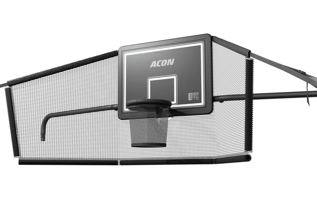 A black basketball with hoop and backboard with nets on the sides on a white background.